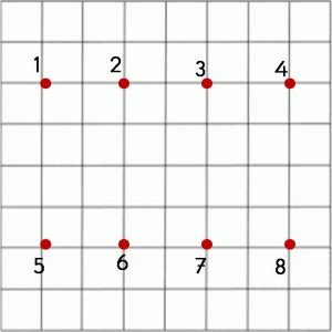Yandaki kareli kağıtta hangi noktaları birleştirerek kare çizebiliriz?1-2-5-6 1-5-3-7 1-4-5-8